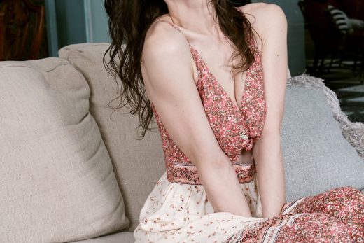 Hot blonde secretary Paige F goes topless on a sofa in a teasing manner