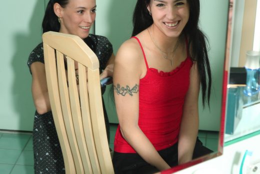Lovely babe Masha shows off her round tits in a sexy lingerie striptease