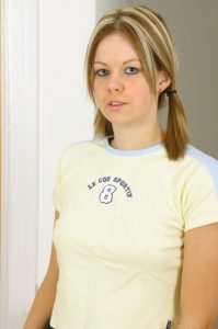 Young blonde Hanna Rey has sex with a boy in glasses and white knee socks